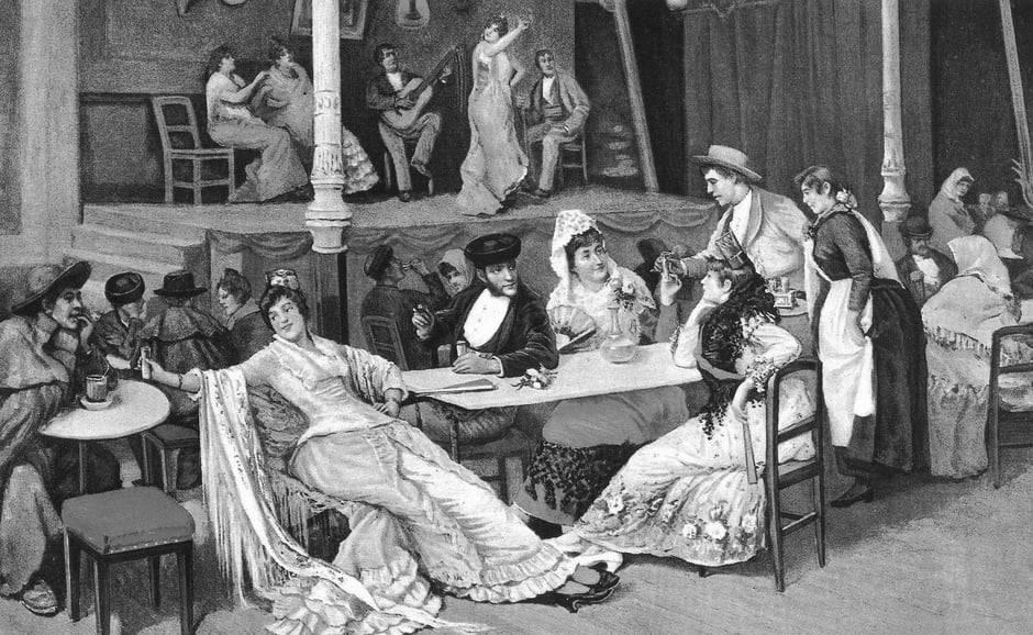 En primer lugar, es por el famoso mito del duende. Sin entrar en las relaciones de marketing de otras músicas con la drogadicción (que supongo que las hay, pero no las conozco en profundidad) en el flamenco se ha venido produciendo desde siempre. Me refiero a vender el mito del músico flamenco como un desharrapado y muerto de hambre, marginado del sistema, que pasa de la disciplina y de las normas, que consume droga y es irresponsable, pero que puede hacer todo esto porque tiene un duende, un talento innato que le viene del cielo solamente por ser flamenco, y que le permite no estudiar, no responsabilizarse, no pasar por el aro de la burguesía… porque está tocado por los dioses y su voz, o sus manos, o su alma, no obedecen a reglas o a imposiciones, son libres como la naturaleza, y en eso reside su genialidad. ¿Se han fijado bien en lo que digo? No es que sean geniales, y por eso puedan pasar de las normas. Eso sería un argumento bastante estúpido, pero va incluso más allá: son geniales precisamente porque pasan de las normas establecidas, y si las siguieran, perderían genialidad... No sé exactamente cómo ni cuándo se estableció este mito, aunque imagino que fue para proteger, a partes iguales, la autoestima y las posibilidades de trabajar de todos aquellos que bebían y se drogaban y llegaban tarde y mal a los escenarios. Imagino que todo esto viene de la época de los Cafés Cantantes, promovidos y financiados por empresarios que no tenían ni idea de lo que estaban vendiendo y que se iban a las cuevas y a los barrios marginales a comprar la voluntad de los artistas y se los llevaban de allí sin saber de dónde venían ni lo que iban a hacer, sólo para vender lo exótico y lo puro de su arte aún sin contaminar por la sociedad capitalista. Así sucedió que los cafés cantantes empezaron a convertirse en lugar de encuentro de proxenetas y traficantes de droga y que llevamos arrastrando la mala fama desde entonces. Me figuro que fueron todos estos personajes (que habría por aquel entonces flamencos de todo tipo, yo me refiero a los que sí que la liaban) los que empezaron a vender la moto de que es que tenía que ser así, que si querían flamenco, iban a tener que aceptar las putas y la droga y a los artistas llegando tarde y borrachos,porque en eso consistía el flamenco, consistía precisamente en eso, y, si no podían aguantar un poco de cachondeo, se iban a quedar sin flamenco. Supongo también que los empresarios, acostumbrados al numerito y al postureo circense del siglo XIX, no tuvieron ningún problema en fingir que se creían tal disparate, primero porque tenían que hacerlo porque esos primeros flamencos no tenían nada que perder y no iban a poder chantajearles con dinero, pues sí que era cierto que pasaban del dinero y de la burguesía y no tenían ningún problema en dejar los cafés cantantes y volver a la vida que conocían, y segundo, porque no sólo había que aceptarlo, sino que estos empresarios se dieron cuenta de que el cuento del duende podía reportarles incluso más dinero, era exótico, era pintoresco, los extranjeros pagarían cantidades exorbitadas de dinero por esa especie de safari a la España inadaptada, salvaje y profunda que escapaba al corsé social y burgués. Muy heroico todo.